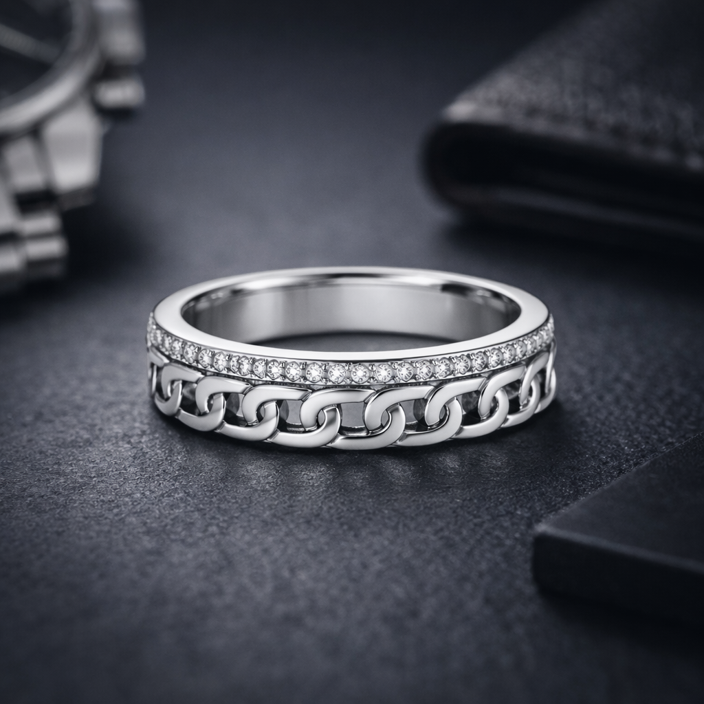 - Design: Chain-link band with stone detailing